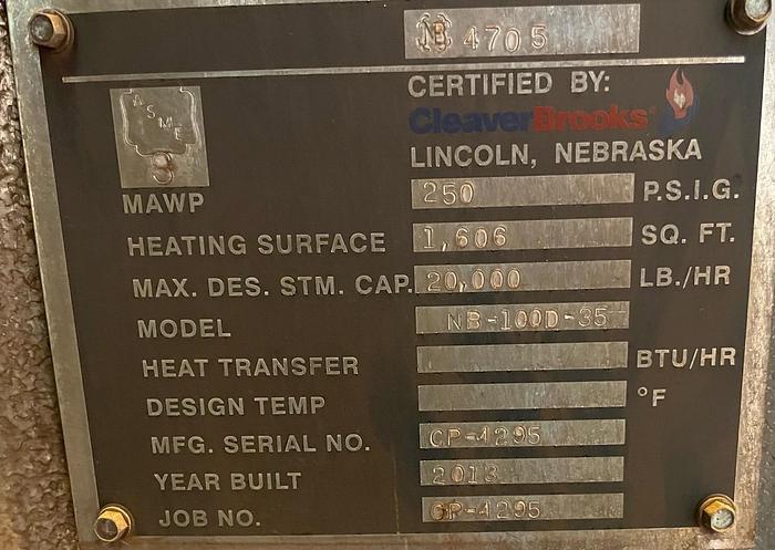 2013 Cleaver Brooks NB-100D-35, 600 HP, 250 PSI water tube, steam boiler
