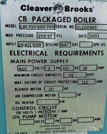 500 HP Cleaver Brooks 200 PSI Steam Boiler 2001 Model CBI-700-500-200